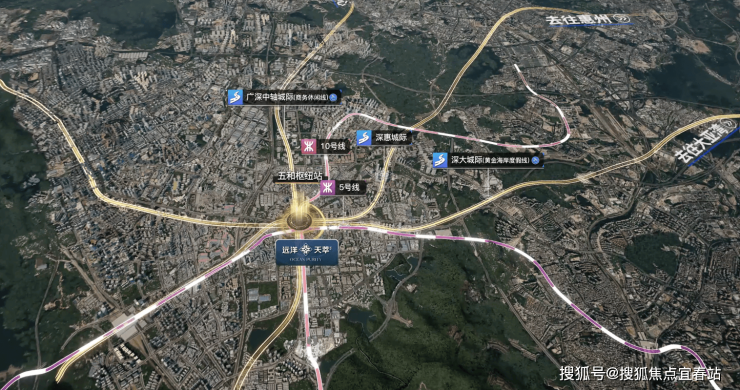 五和超级枢纽,湾区出行一步直达1 站即达五和,接驳环中线 5 号线,串联深惠(在建)、深大(在建)、广深中轴(规划)三大城际,未来客流稳居深圳前三;近享枢纽一站式繁华商业,远可高效畅达粤港澳大湾区。