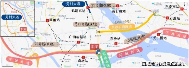 在建的地铁有10 号线广钢新城站和22 号线南漖站,约700米,11 号线鹤洞东站还在建设中。