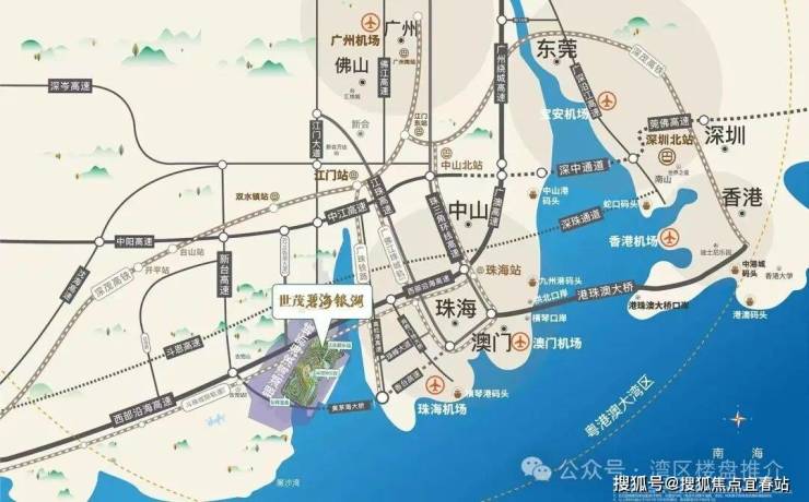 緊密連接港珠澳大橋、深中通道與廣佛都市圈北通道,緊鄰灣區第三大高鐵站江門站,享受黃茅海開通利好,速达港澳直通江门,輻射灣區五大機場,海運直達香港市中心,實現與周邊城市群快速互通。