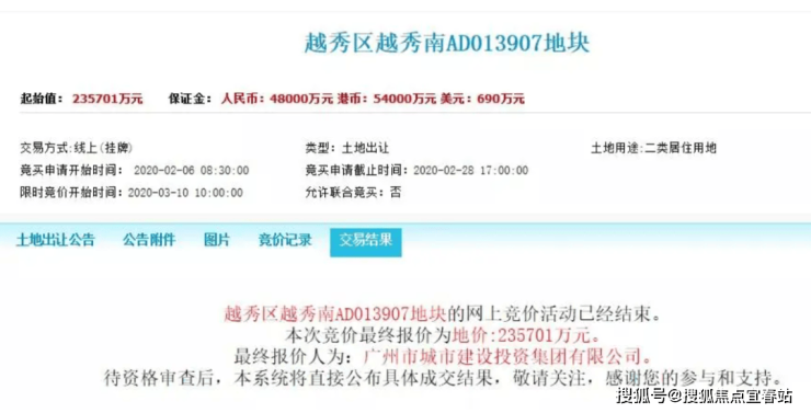 广州城投·东园公馆所在的越秀区越秀南AD013907地块,为2020年3月广州城投以235701万元竞得,扣除1.3万㎡的配建面积后,折合楼面价64576元/㎡。
