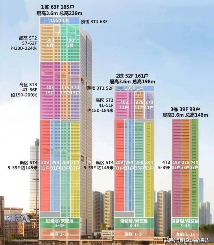 首推北区1栋、2栋,共约348套,分高低区设计: 低区(5层起,150米内):约209-304㎡四房以上大户型。 高区(42层起,150-200米):约370-403㎡ 4+1房五卫,带家庭厅及家政套间。 超高区(58层起,200米以上):约500-700㎡顶级大平层。 顶楼:约1050㎡整层大平层(仅3套)。
