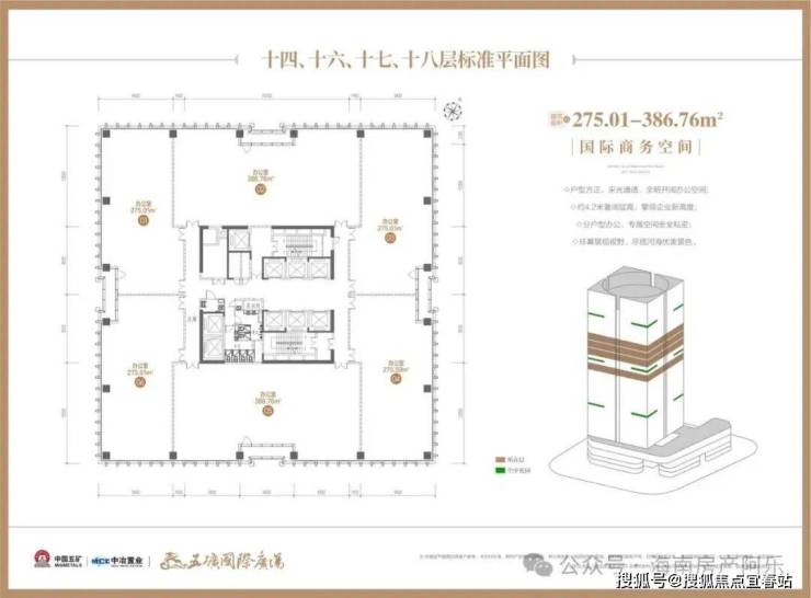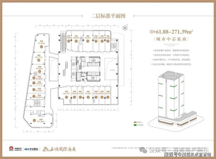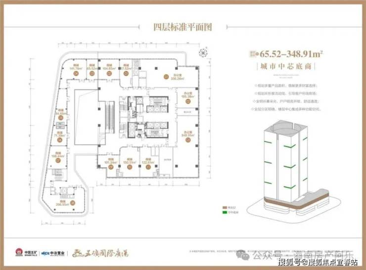 【楼栋概况】楼体高度110米,地下二层地上22层,1-4层为城市中芯底商,首层层高约6米、2层层高约为4.5米、3/4层层高约为4.35米;5至18层为国际商务空间,层高约为4.2米。