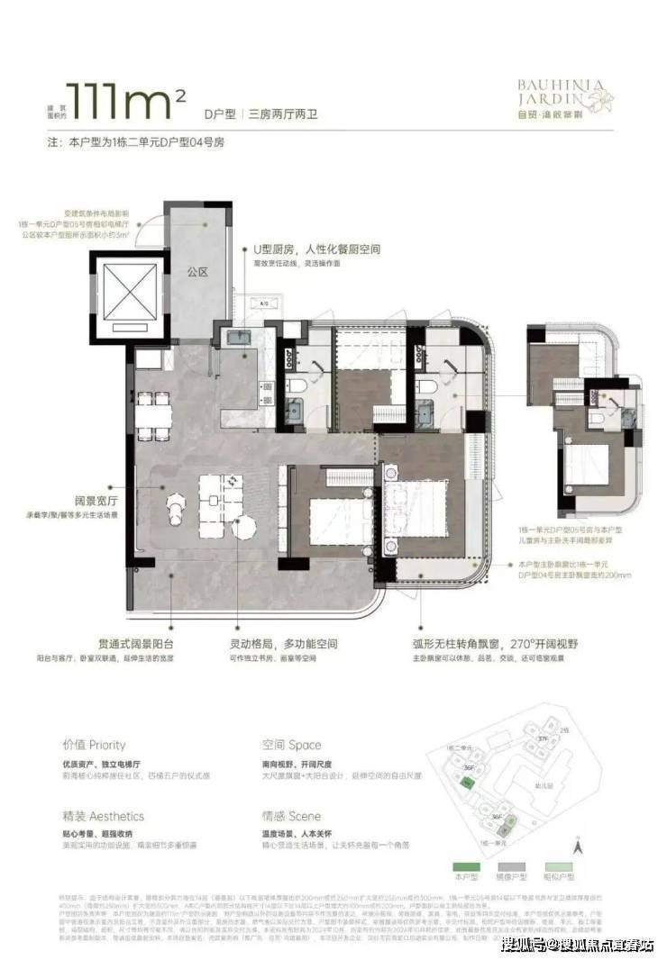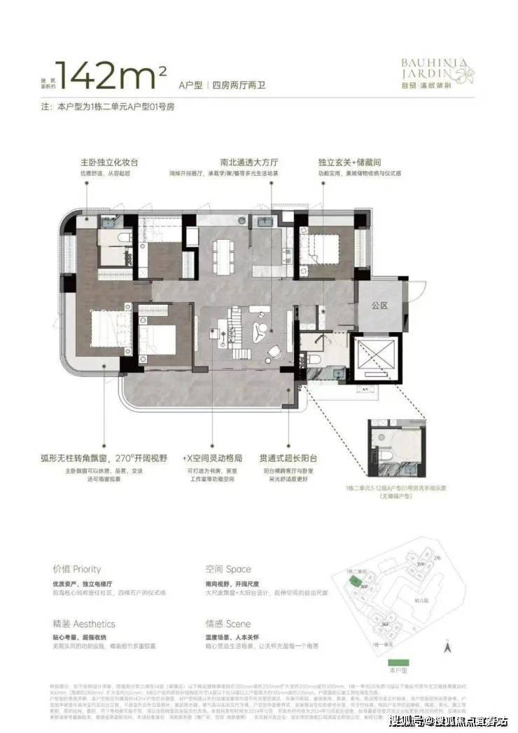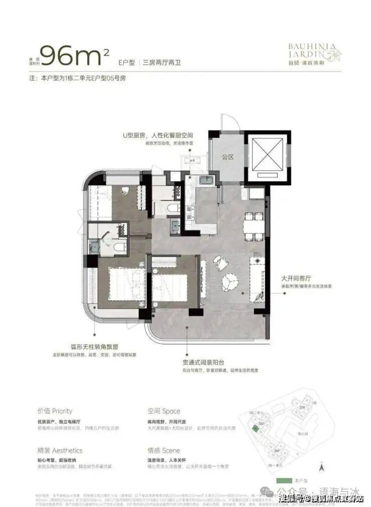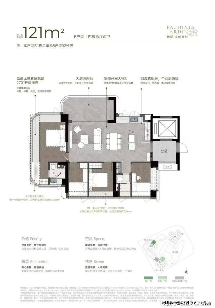 户型设计兼顾实用性与舒适度,4梯5户配置独立电梯厅,户户享有南向视野,空间通透敞亮;270°弧形无柱大尺度飘窗、大宽厅、大阳台设计,拓展更多使用空间与观景体验。