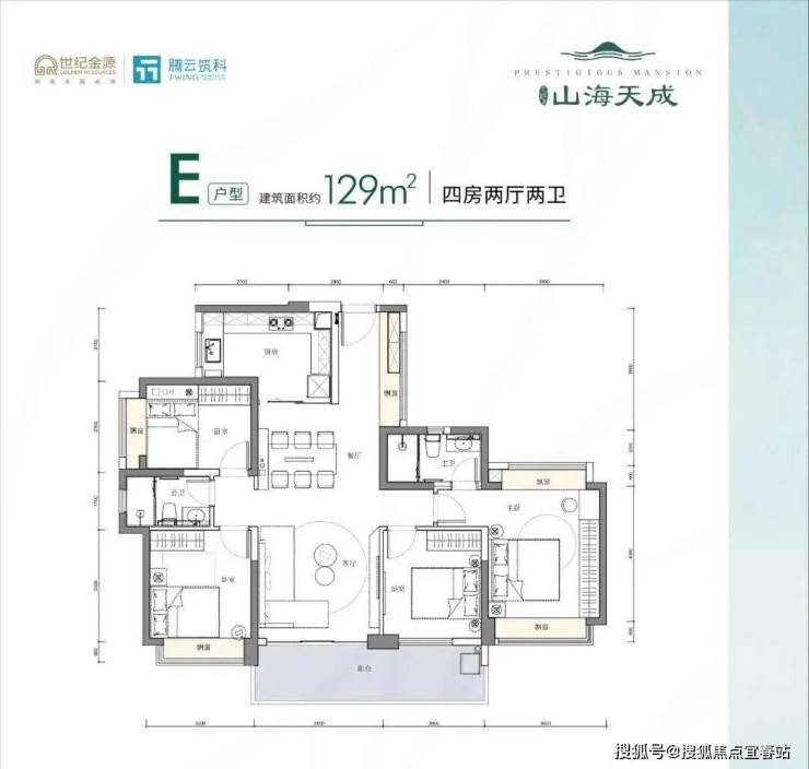 129㎡的4房2厅2卫,设计的是竖厅双龙抱珠格局,客厅3.8米开间,四开间朝南,4个卧室分别是3.6米/3.2米/3米/2.7米的宽度,U型厨房,