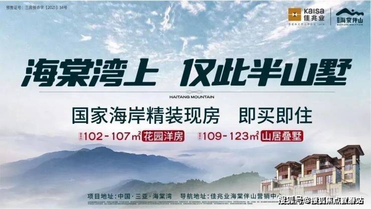 项目地址:三亚·国家海岸·海棠湾南田路佳兆业海棠伴山营销中心(方大太阳城南侧约15米) 开发商:三亚佰佳世纪房地产开发有限公司 物业公司:佳兆业美好物业 总建筑面积:59258.41㎡ 总计容建筑面积:44293.29㎡ 容积率:1.2建筑密度:24.83%绿化率:40.05%楼栋限高:24m 产权年限:70年 产品户数: 总434户,其中洋房301户,叠拼133户 产品信息: 建面约102-107㎡三室度假洋房,三房两厅两卫 建面约109-123㎡伴山揽景叠拼,三至四房两厅两卫规划架空层休憩空间,荟萃健身房、茶室、童趣娱乐空间等业主尊享休闲娱乐配套,构筑生活风雅大境。融儿童空间、休闲会所、有氧步道等丰富全龄休闲、运动配套与园林,打造惬意、健康的伴山生活体验。 将山地价值最大化,未来打造多重山地享法。伴山人生,尽情自在。 国家海岸海棠湾 千亿滨海配套群 海棠湾与蜈支洲岛隔岸相望。延绵约22公里醇美海岸线,聚集千亿旅游度假资源。以“国家海岸”战略的浓墨重彩,勾勒令世界倾慕的繁华图景。