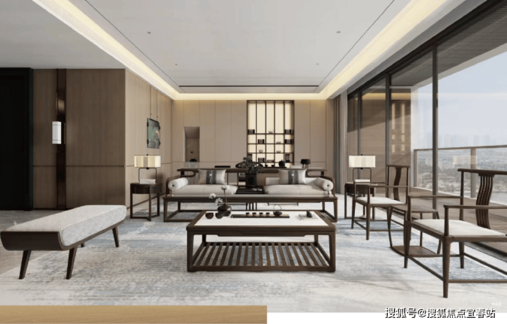 独特的“金丝镜框式”窄边框立柱与巨幕弧面玻璃的结合,与江景无界,独享雍容生活。