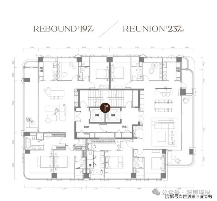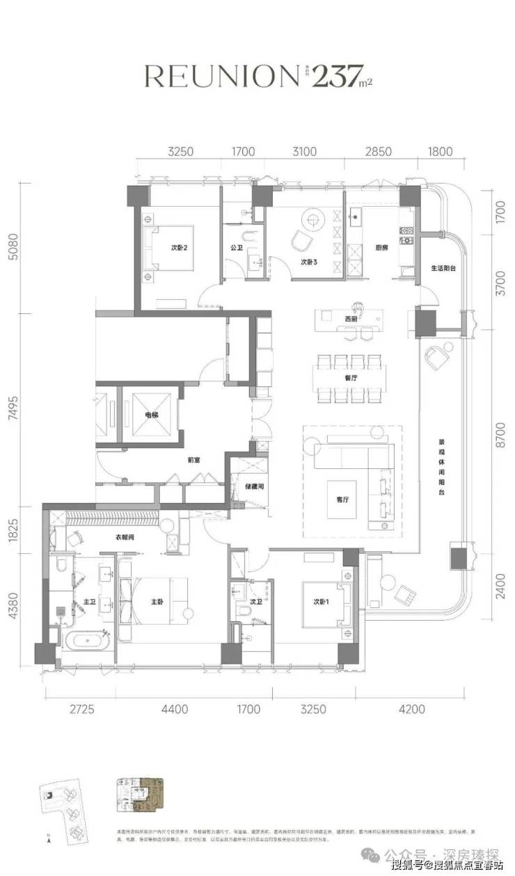 237㎡的4房2厅3卫,设计的是竖厅双龙抱珠格局,一梯一户,专梯入户设计,赠送私用电梯厅,客餐厅8.7米开间,LDKB一体化设计,分别做到了主卧35.3㎡/次卧套间15.93㎡/次卧16.51㎡/次卧12.34㎡(包含墙体飘窗),客厅连接餐厅出8.7米长的超大观景阳台约15.66平,另外东南向还有个观景阳台约10.08平,西厨位置有6.66平生活阳台,U型厨房另设西厨岛台,卫生间干湿分离,得房率约100%(包含赠送),东北朝向。