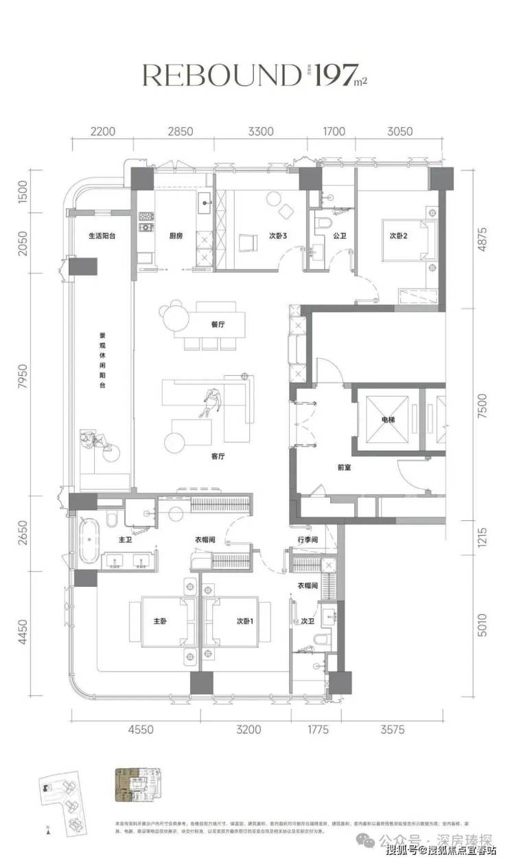 197㎡的4房2厅3卫,设计的是竖厅双龙抱珠格局,一梯一户,专梯入户设计,赠送私用电梯厅,客餐厅7.95米开间,LDKB一体化设计,四开间朝南,分别做到了主卧28.2㎡/次卧套间18.3㎡/次卧14.87㎡/次卧11.71㎡(包含墙体飘窗),客厅连接餐厅出10米长的超大观景阳台约22平,U型厨房,卫生间干湿分离,得房率约100%(包含赠送),西南朝向。