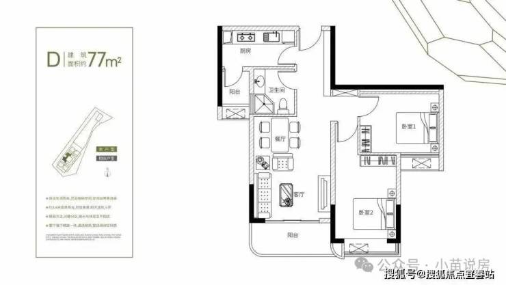 建筑面积约76-78㎡2房+1卫(灵活多变+1多功能空间)