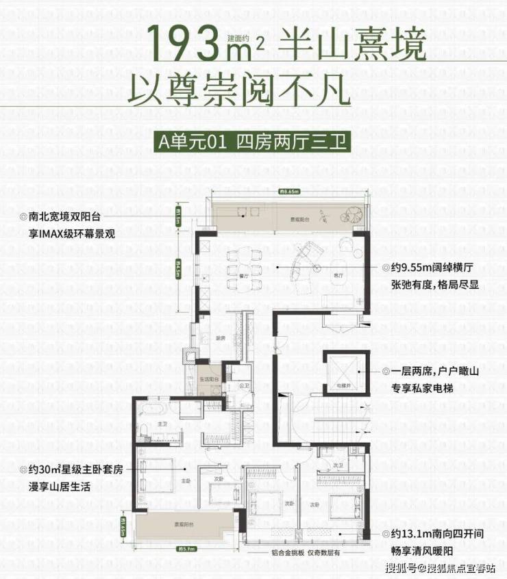 同样的专梯入户,豪宅感扑面而来,该户型为顶级大户型,四阳台设计,最大有10.55米的景观阳台和180度视野的餐客厅空间奢阔气场尽显,罕见的南北瞰景四阳台设计,让家的每个角落都能欣赏美丽的山景和城市景观。所有的开窗面都尽可能放大,客餐厅、书房、卧室、几乎都能享受超宽超大屏