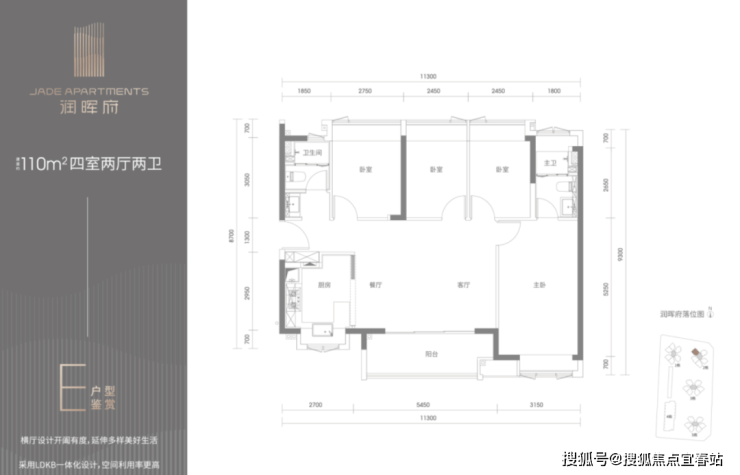 E户型是110㎡四房二卫横厅户型,则是B户型的放大版。西南朝向,户型方正,三个次卧的面积均在9平米以上,主卧18平左右。再加上双面采光对流,基本上不存在采光死角。