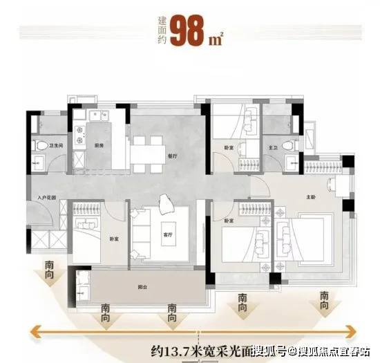 项目采用改良蝶型或风车型楼型,做到户户朝南,户型设计方面,大阳台、大飘窗是标配,主卧或双面大飘窗。