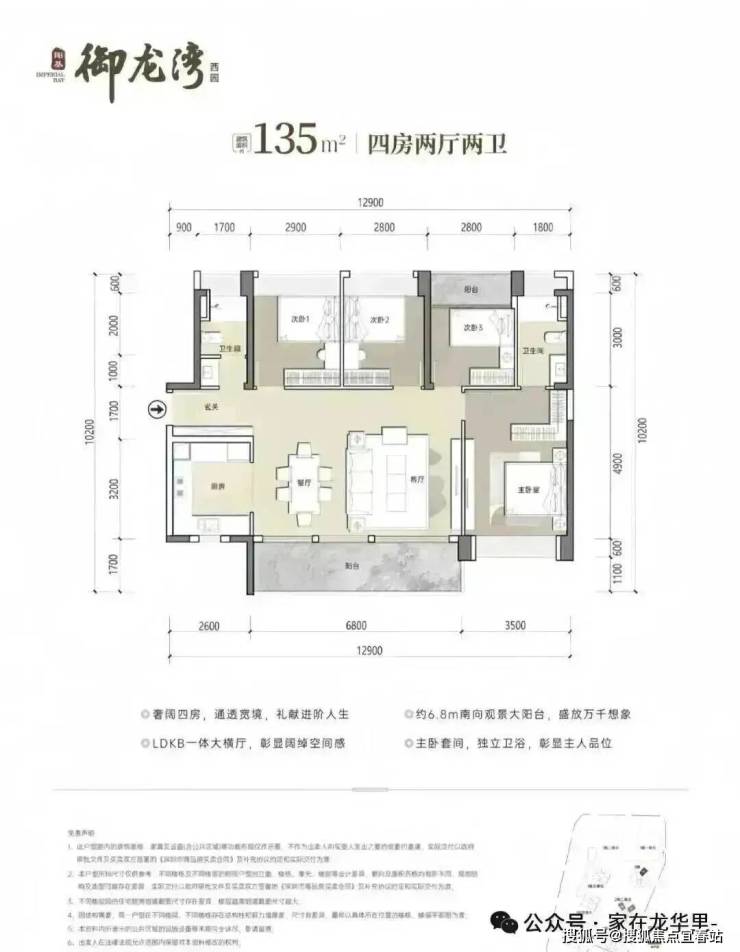 135㎡4房2卫,设计的是横厅南北通透格局,客餐厅开间6.8米,LDKB一体化设计,四开间朝南,U型厨房,公卫三段式分离设计,得房率约79.25%(不含赠送),阳台主朝东南或西南向,加上赠送得房率约90%