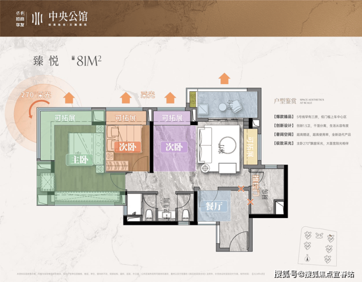 项目主推建面约81-159m²三至四房,新规后最新迭代户型,超长面宽,享270°双面采光,使用率最高超100%。