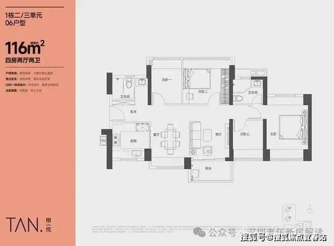 116㎡的4房2厅2卫,设计的是横厅南北通透格局,LKDB一体化设计,进门入户玄关,五开间朝南,超大宽面,主卧南北通设计,U型厨房,得房率:74.35%(不含赠送),阳台主朝东南向。