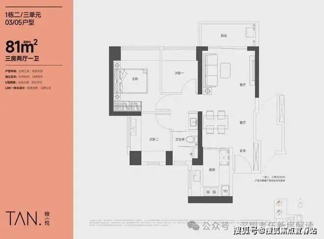 81㎡的3房2厅1卫,设计的是竖厅格局,LKDB一体化设计,进门入户玄关,有1个次卧做的双飘窗,U型厨房,卫生间三段式分离,得房率:74.34%(不含赠送),全部西北朝向。