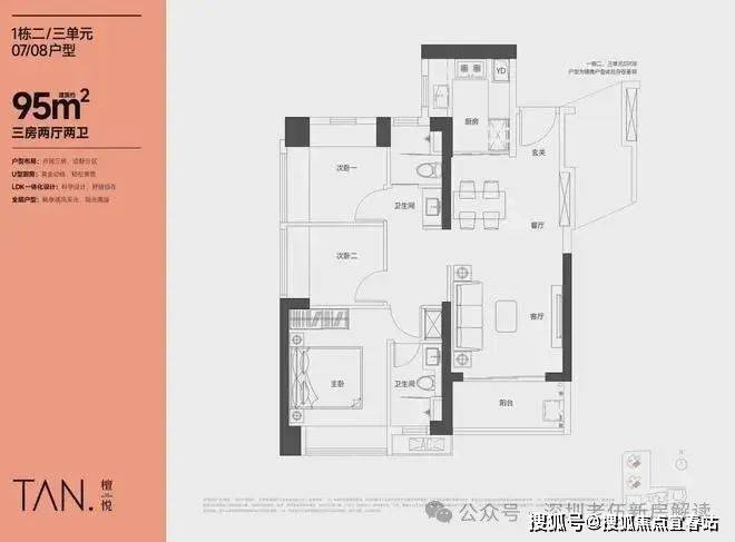 95㎡的3房2厅2卫,设计的是竖厅格局,LKDB一体化设计,进门入户玄关,有1个次卧做的双飘窗,U型厨房,卫生间三段式分离,得房率:74.34%(不含赠送),全部东南朝向。