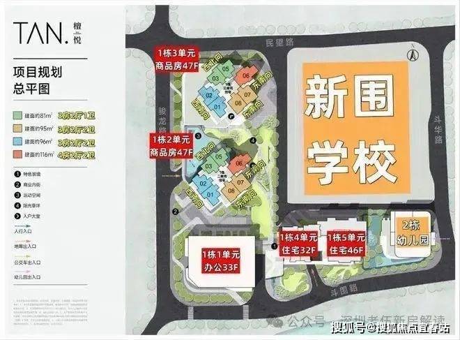 龙华【檀悦府】总占地面积约1.6万㎡,总建筑面积约19万㎡,计容建筑面积约14.1万㎡,容积率8.82,绿化率40.12%,共由4栋32-47层高住宅+1栋33层办公组成,其中1栋1单元办公33F,1栋2/3单元商品房47F,1栋4单元住宅32F,1栋5单元住宅46F,2栋配建1所6班制幼儿园。