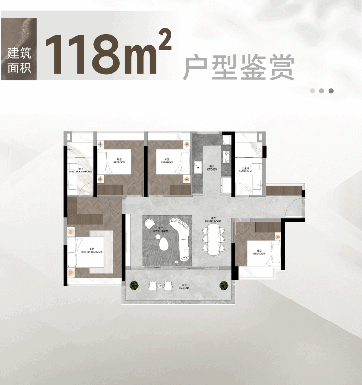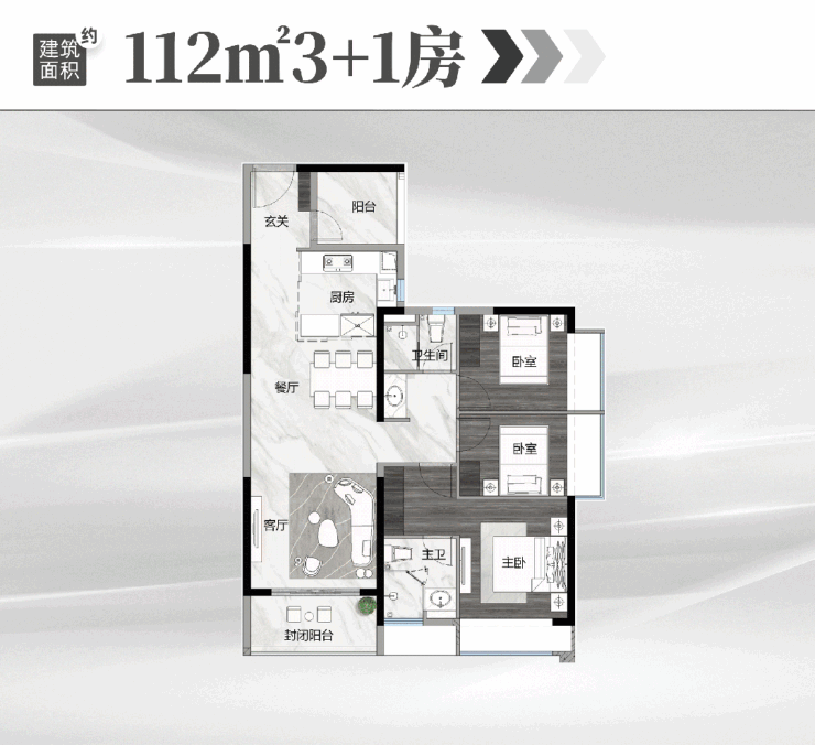 112㎡ 3+1房2厅2卫,+1房多功能空间,两梯四户南向低密度,LDKB一体化设计,全屋80cm阔景飘窗升级。