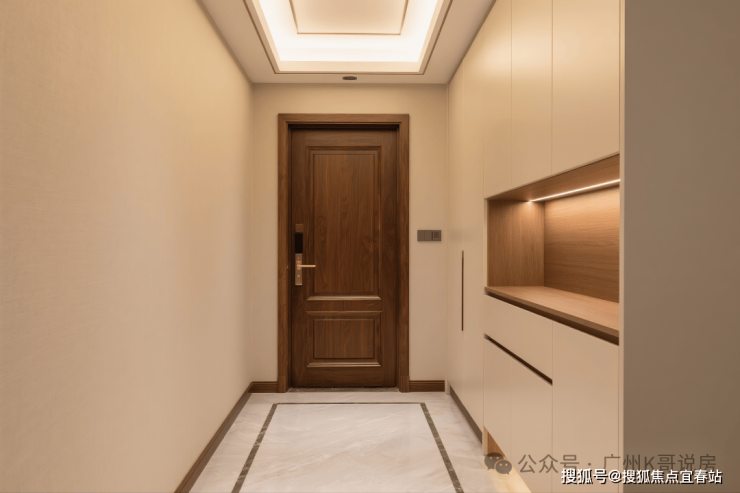 整个公区的连贯墙面打造了凹墙设计,从玄关延伸至客厅,形成全家的隐藏式储物系统。