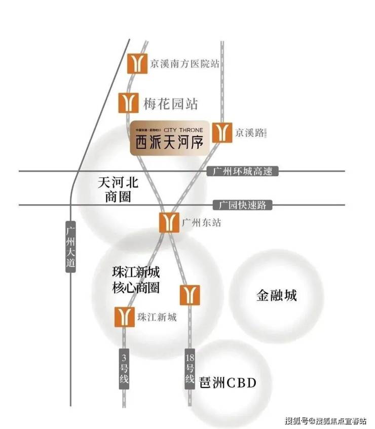 项目距离地铁3号线梅花园站仅350米,2站广州东,5站珠江新城,8站机场北。周边还有地铁18号线北延线京溪站预计2026年开通,开通后1站广州东站、2站冼村、3站琶洲。