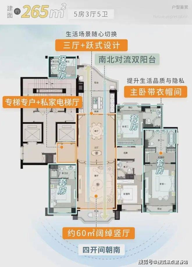 建面约238㎡五房三厅四卫设计,餐客厅厨阳台于一体,南北大对流,形成了阔绰的空间结构。