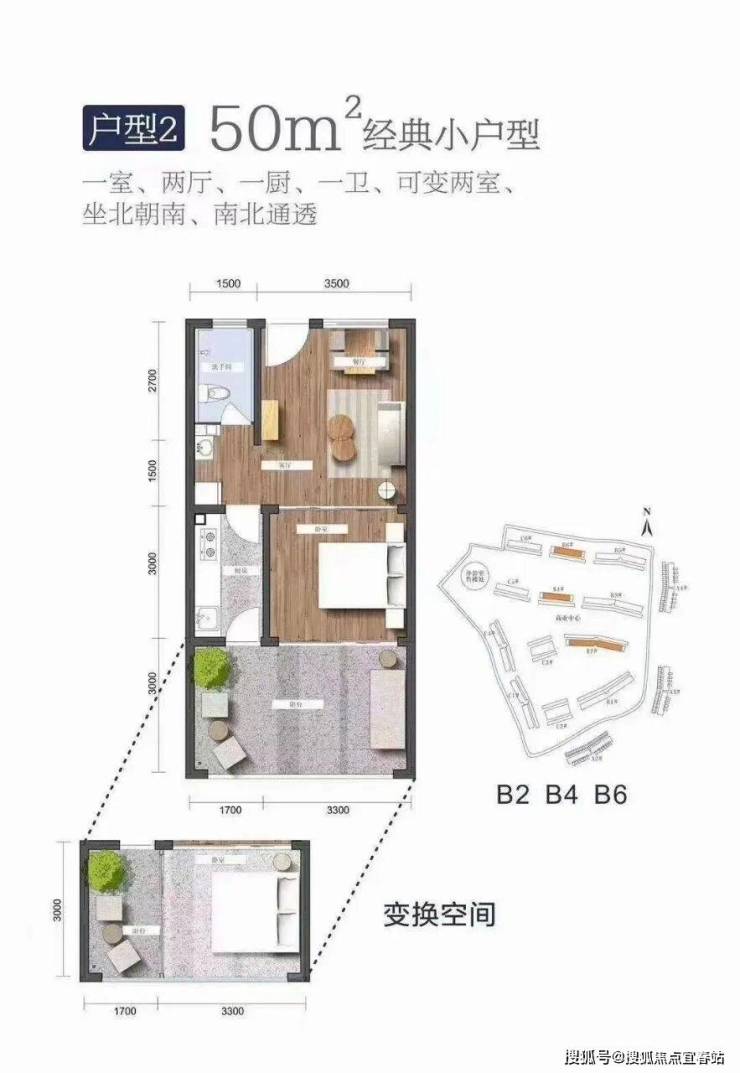 建筑面积51㎡,一室一厅一卫,可变换两室,坐北朝南,南北通透,硬装交付