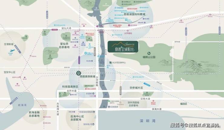 鼎胜金域阳光家园西侧为 西丽留仙洞总部基地,东北侧为 大学城,东侧为 塘朗山,西南侧是 西丽高铁站。