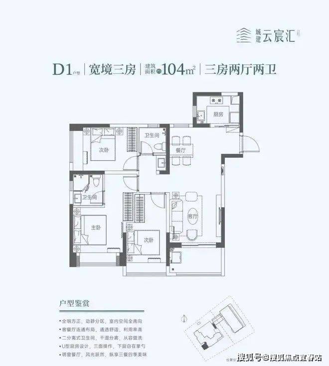104㎡的3房2厅2卫,设计的竖厅南北通透格局,餐客厅一体化,U型厨房,阳台西南朝向。