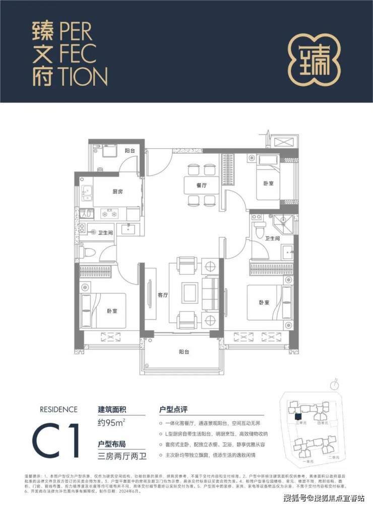 95㎡的3房2厅2卫,设计的是双龙抱珠格局,客厅3.4米开间,一体化客餐厅,三开间朝南,L型厨房还带1个小生活阳台,公卫三段式分离设计,得房率约85%(包含赠送),阳台朝东南或西北向。