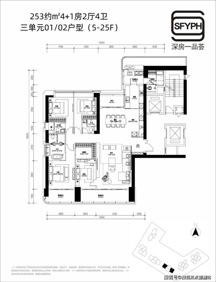 5F-25F两边端头位是253平㎡四房,中间188㎡可三改四房户型