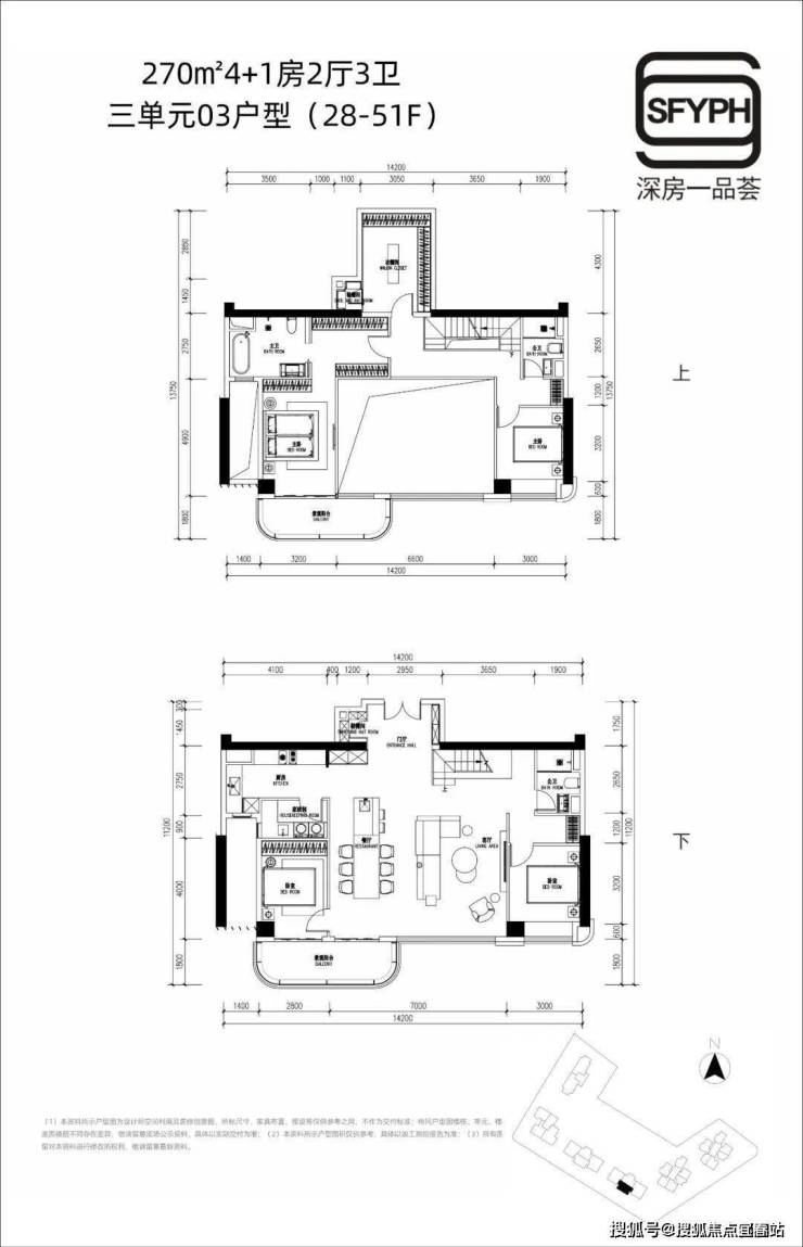 27F-51F,两边端头位是270㎡户型,中间270㎡复式户型(标准复式层高)