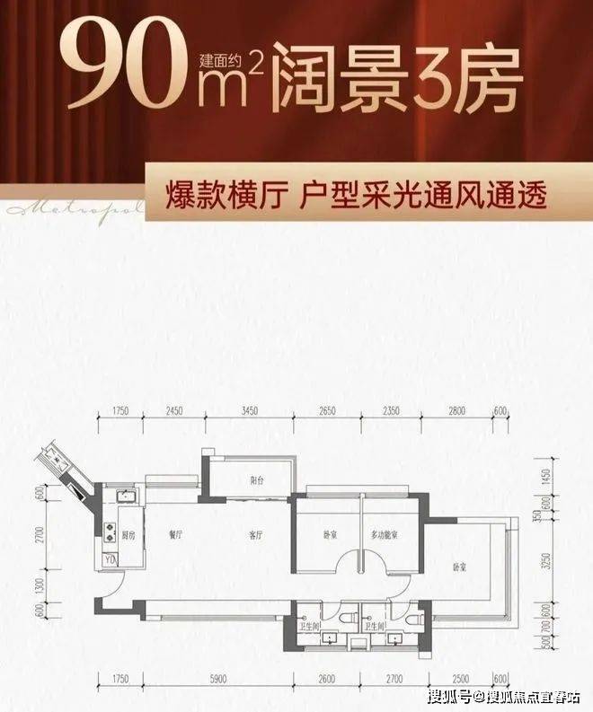 90㎡的3房2厅2卫,南北通大横厅户型,动静分区全明户型,U型厨房,餐客厅一体,客厅开间约5.9米,三个房间和客厅都带大飘窗,主卧双飘窗带独立卫生间。