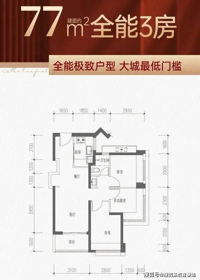 77㎡的3房2厅1卫,经典的竖厅户型,动静分区,S型冰箱位,餐客厅一体,客厅开间约3.1米,三个房间其中一个次卧和主卧都是双飘窗。