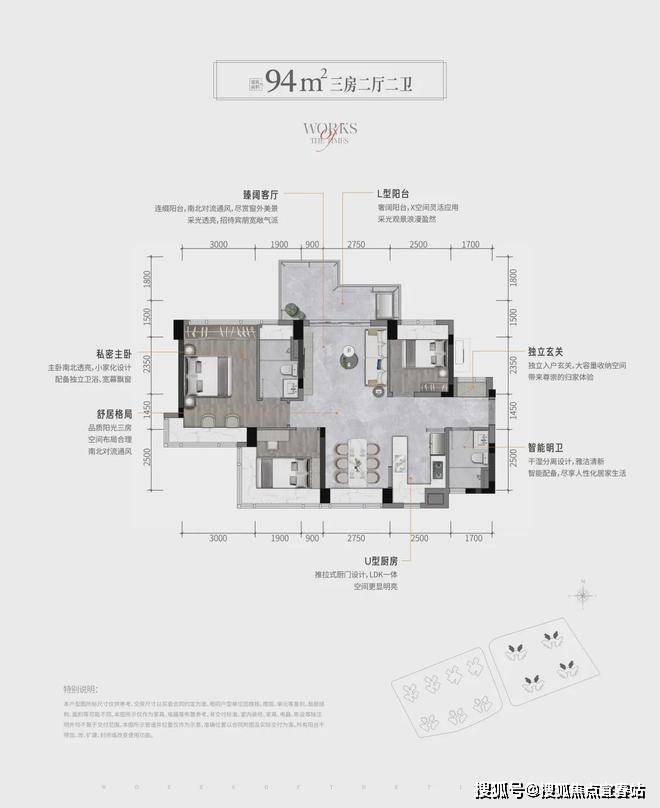 建面约94㎡的三房两厅两卫的产品共有两种户型。