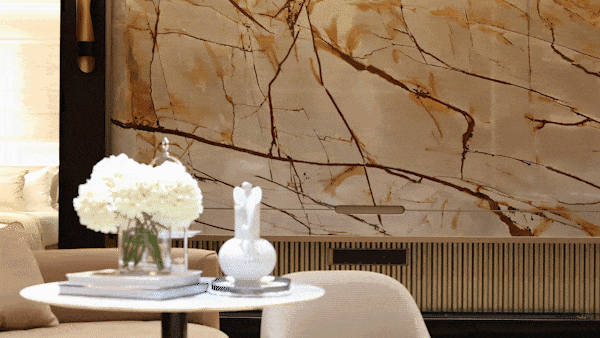 进入入户大堂,奢石的运用更是达到艺术化与功能性的共生。约3.5米宽、7.9米高的潘多拉奢石背景墙,石材天然的棕白纹理如飞龙盘旋而上,色彩随光影流动,赋予静态石材动态艺术感。