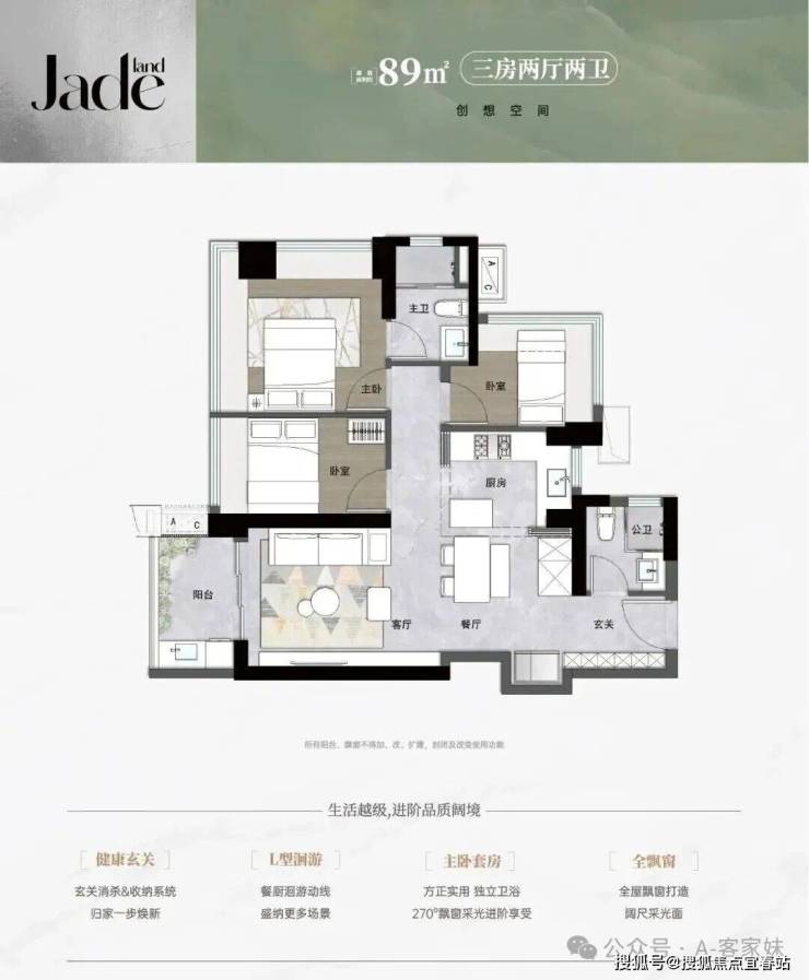 3栋89㎡的3房2厅2卫,设计的是经典竖厅格局,进门入户玄关,LDKB一体化,S墙设计预留冰箱卡槽位,三开间朝南,主卧+1个次卧270度飘窗,L型灵动式厨房,卫生间干湿分离,得房率约92%(包含赠送),西南或东南朝向。