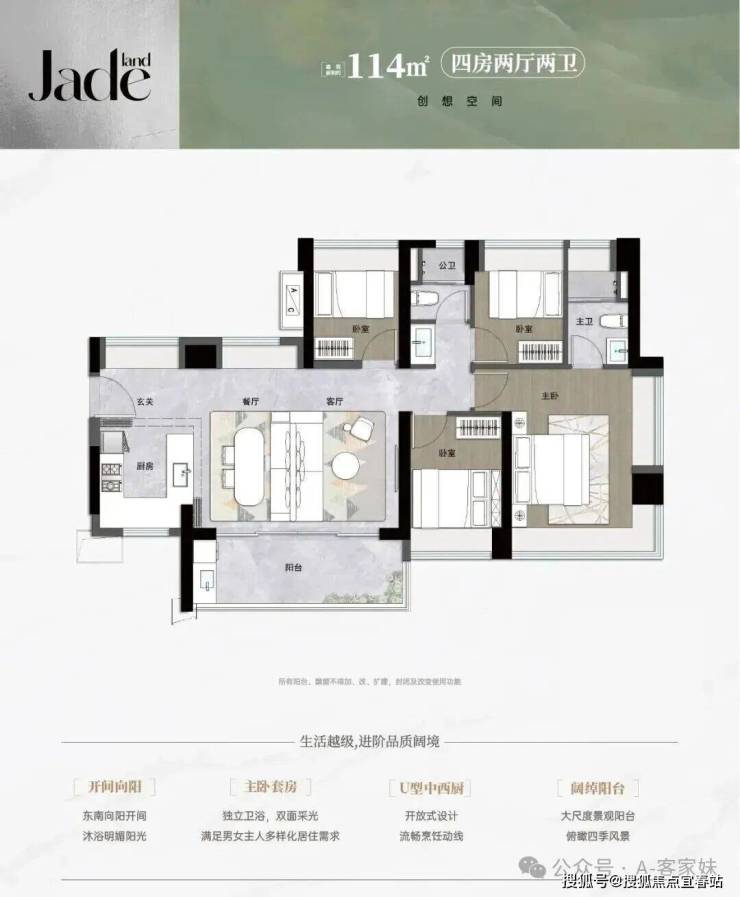 114平㎡的4房2厅2卫,设计的是横厅南北通透格局,进门入户玄关,LDKB一体化,五开间朝南,全屋9面飘窗,主卧大套间,U型厨房,卫生间干湿式分离,得房率约92%(包含赠送),阳台主朝东南向。