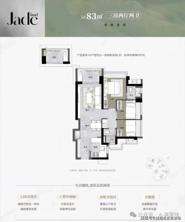 3栋5栋83㎡的3房2厅1.5卫,设计的是竖厅格局,进门入户玄关,LDKB一体化,S墙设计预留冰箱卡槽位,U型厨房,主卫少了淋浴,公卫三段式分离,得房率约92%(包含赠送),阳台西北朝向。