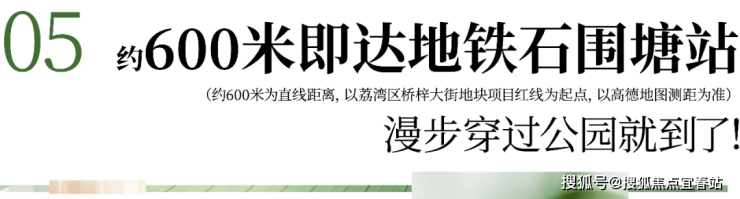 建鑫·如意芳华与地铁11号线石围塘站约600米的距离,恰到好处地平衡了便捷性与安静度。未来业主可通过公园绿带系统舒适步行至地铁站,实现“公园漫步式通勤”。(约600米为直线距离,以荔湾区桥梓大街地块项目红线为起点,以高德地图测距为准)