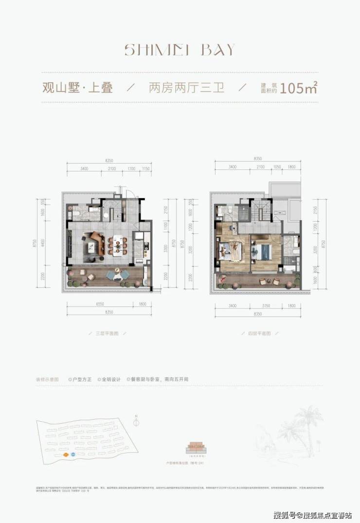建筑面积约 138 - 142㎡,上叠(C 户型)约 138㎡三房两厅三卫,玄关功能多样,动静分层合理,双厅南北双阳台,主卧套房舒适大气,阳光露台格调生活。