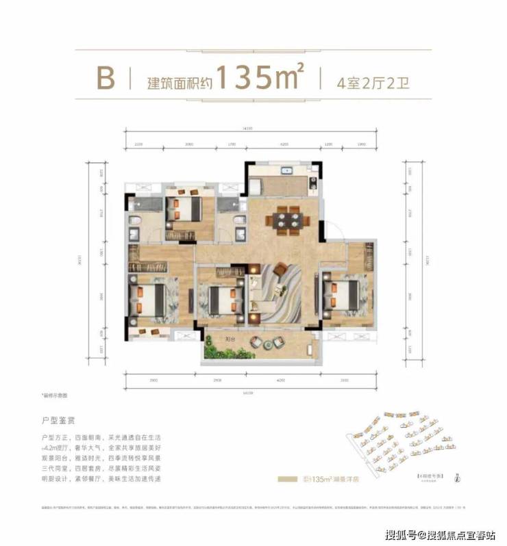 135㎡四房两厅两卫户型,四面朝南采光好,4.2m 宽厅奢华大气,观景阳台四季风景如画,适合三代同堂居住。