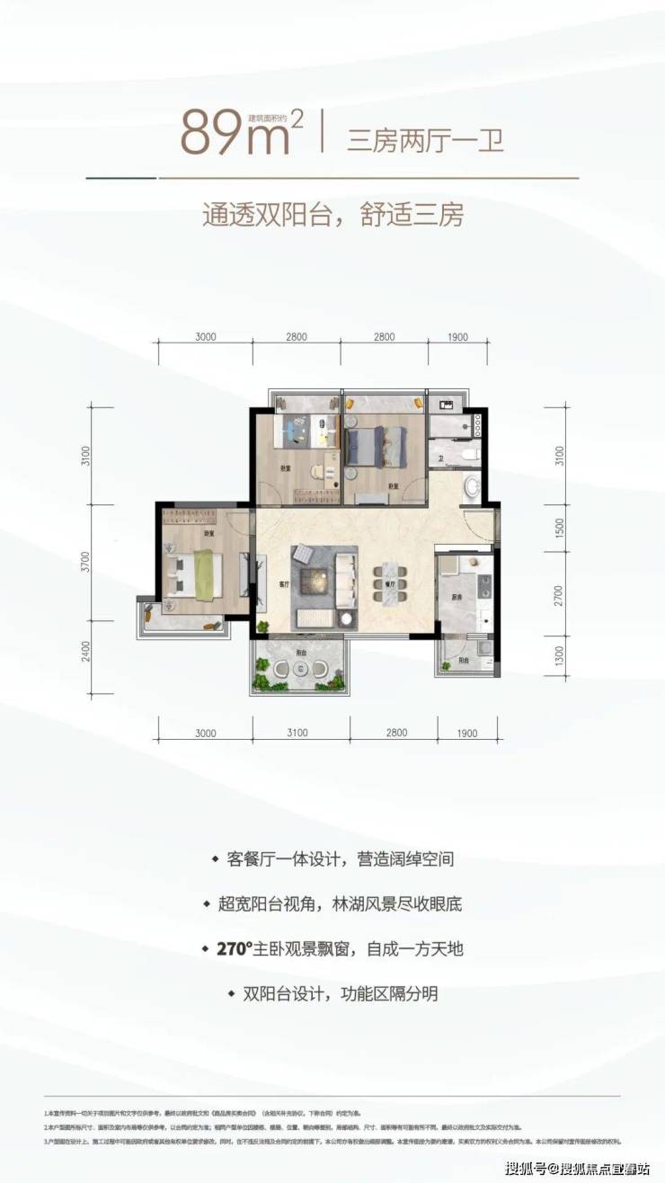 约89㎡三房两厅一卫:通透双阳台,三口之家的舒适三房