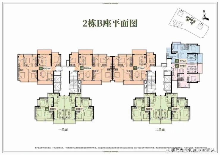 🔺2栋B座二单元04、05户型:面积约为72-74㎡的2房2厅1卫。