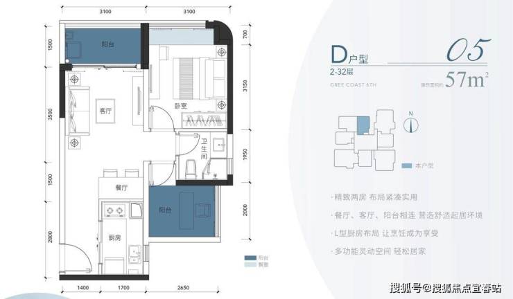 D户型在建面约57㎡的空间中,容纳了三口之家对身心舒展和美好居住的各种向往。