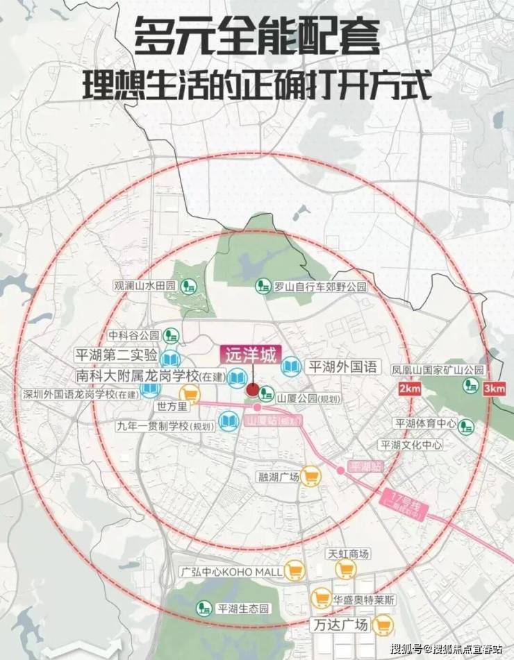 项目自带3所幼儿园,周边5所学校环绕:家门口南科大龙岗附属学校(在建中),1km范围内汇聚深外龙岗学校、平湖外国语、平湖第二实验、九年一贯制学校(规划),真正做到家门口就能满足小孩12年的教育需求!(注:具体以教育局公布为准)