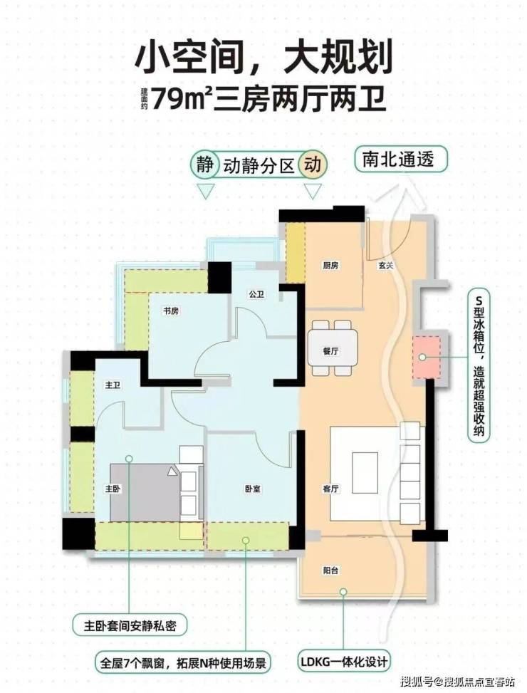 79㎡的3房2厅2卫,设计的是经典竖厅格局,客厅3.3米开间,LDKB一体化,S墙设计预留冰箱卡槽位,动静分区,三开间朝南,3个卧室分别做到了主卧12.1㎡/次卧7.36㎡/次卧6.67㎡(包含墙体飘窗),主卧+1个次卧270°飘窗设计,U型厨房,公卫三段式分离,得房率约88%(包含赠送),东南或西南朝向。