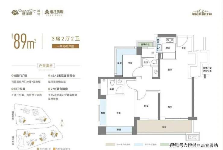 89㎡的3房2厅2卫,02.03户型,设计的是经典竖厅格局,客厅3.4米开间,LDKB一体化,S墙设计预留冰箱卡槽位,动静分区,三开间朝南,3个卧室分别做到了主卧13.79㎡/次卧7.62㎡/次卧6.93㎡(包含墙体飘窗),主卧+1个次卧270°飘窗设计,U型厨房,公卫三段式分离,客厅连接卧室出5.75米长的大阳台,得房率约87.2%(包含赠送),东南朝向。