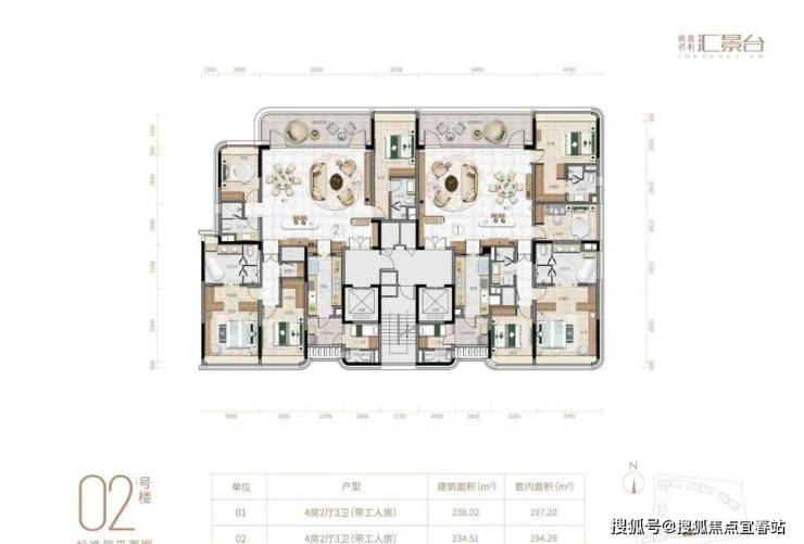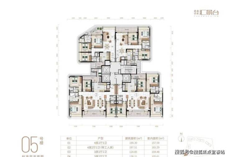 项目由14栋12层小高层组成,产品涵盖123-352㎡三至五房,共8类户型,户型实用率约82-84%