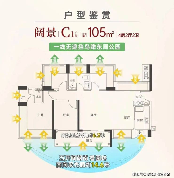▲105㎡的4房2厅2卫,设计的是横厅南北通透格局,客餐厅6.2米开间,五开间朝南,约14.7米奢阔采光面,分别做到了主卧16.9㎡/次卧8.96㎡/次卧8.12㎡/次卧7㎡(包含墙体飘窗),U型厨房,卫生间干湿分离,得房率约100%(包含赠送),客厅连接次卧出10.88㎡的大阳台,首推的1/2栋朝西南向。赠送面积约25.72㎡▼